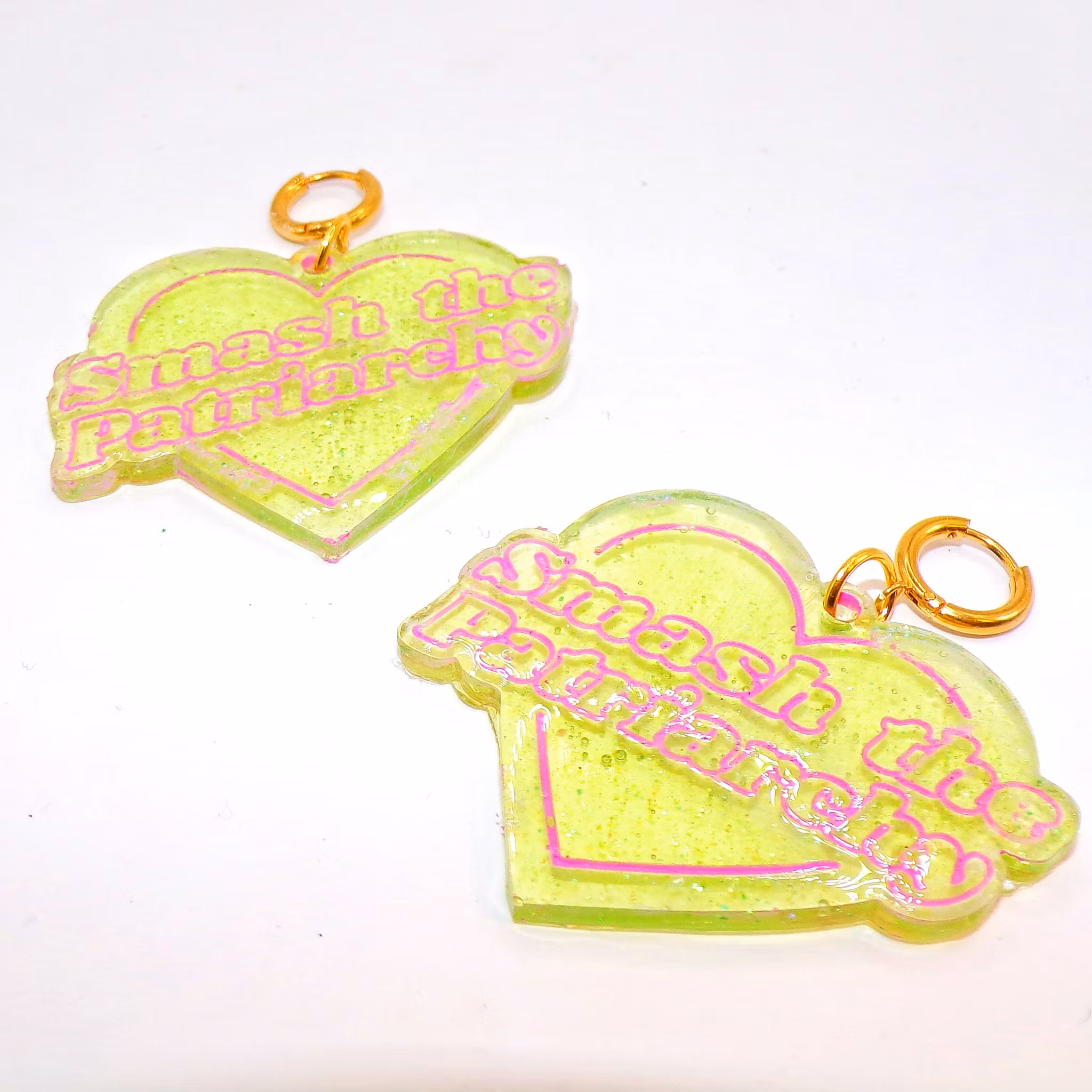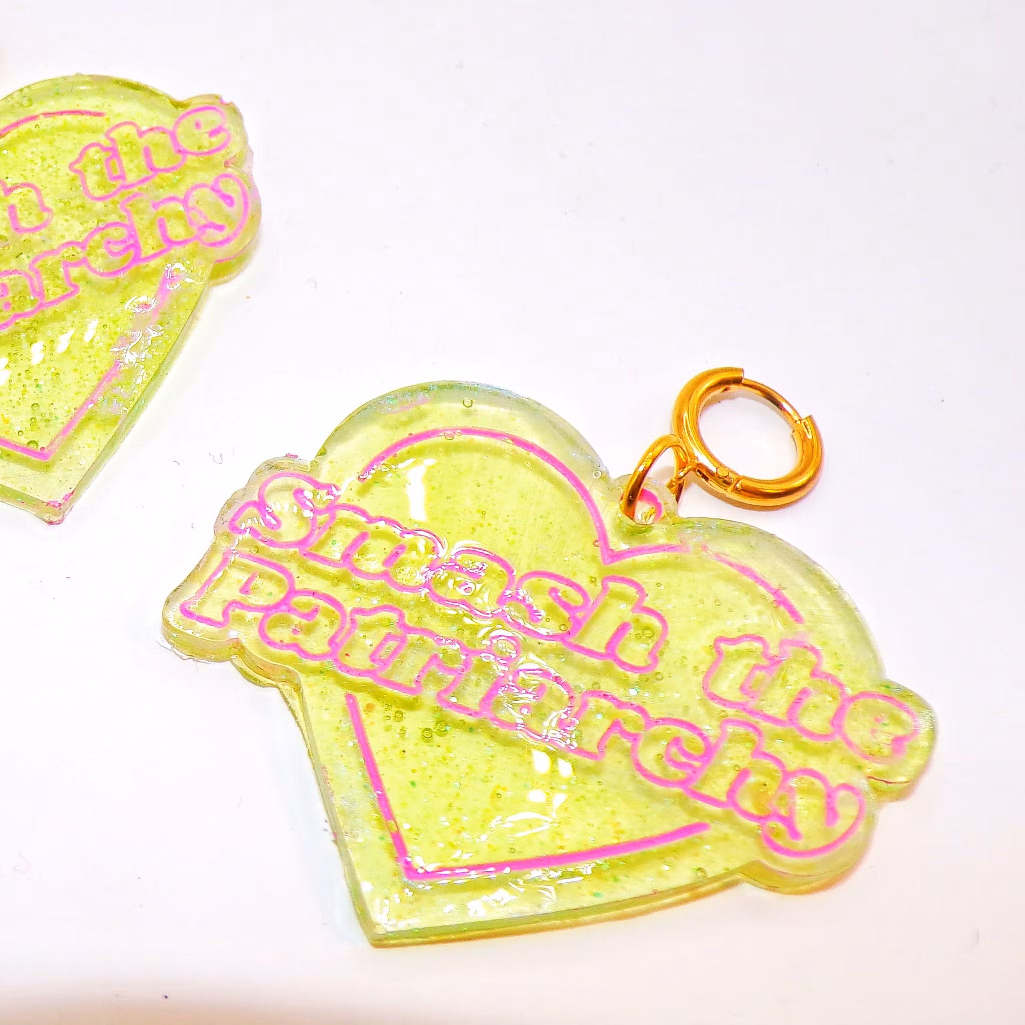 SMASH THE PATRIARCHY vårgrön/rosa 449 kr I LAGER KÖP Dela INFO Nickelfria ringar i guldfärg.Längd hela örhänget: 6 cm.Huvudsakligt material: resin/epoxy.Handgjort av ditt lokala yrväder.