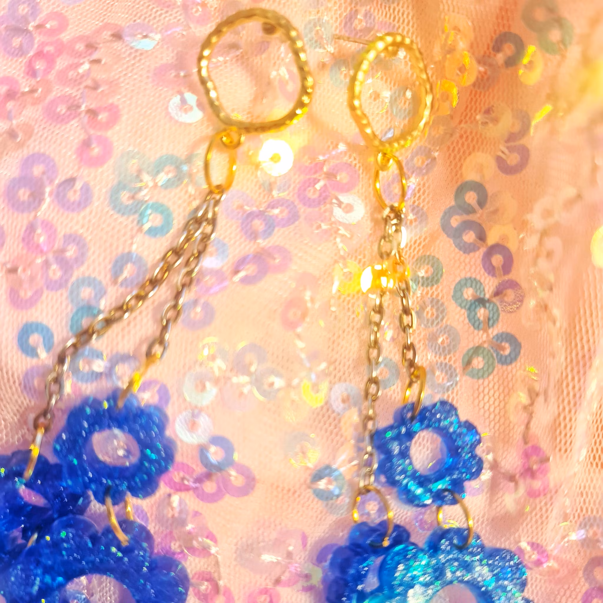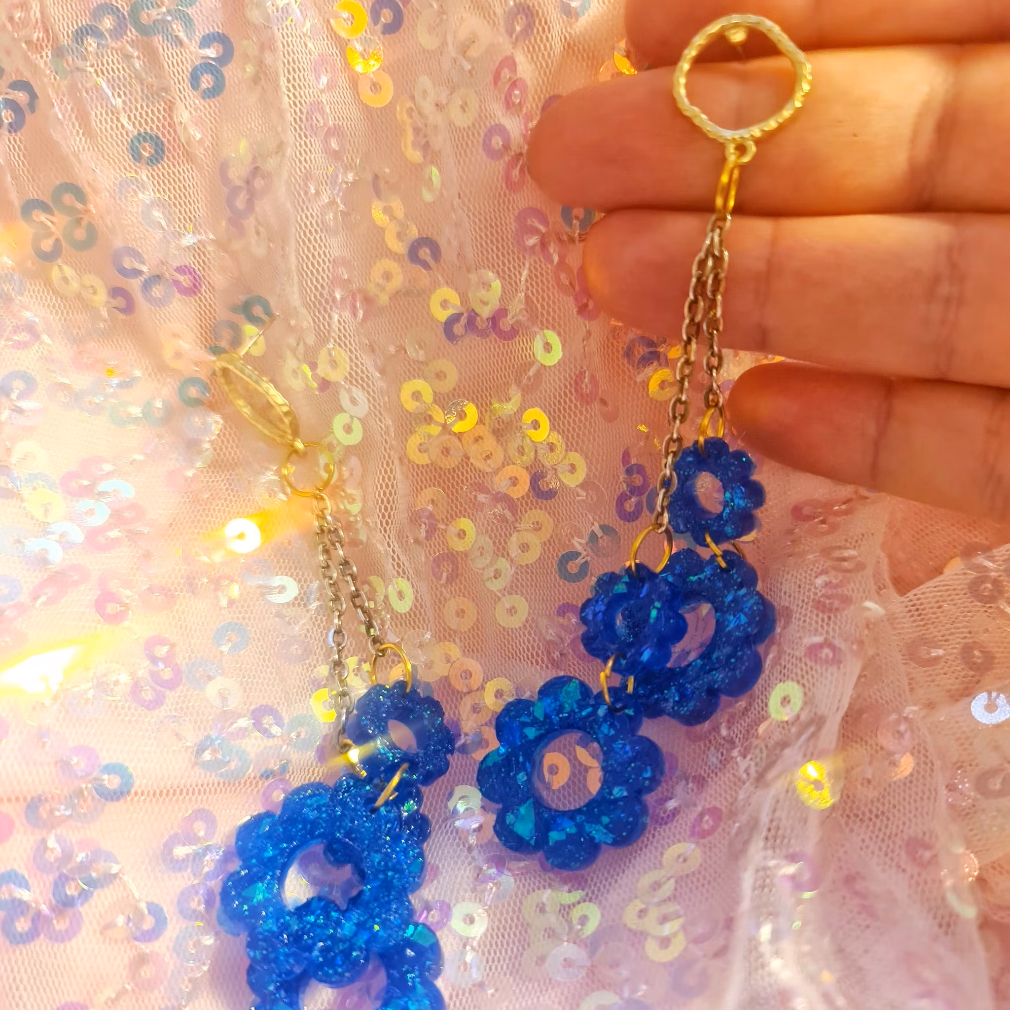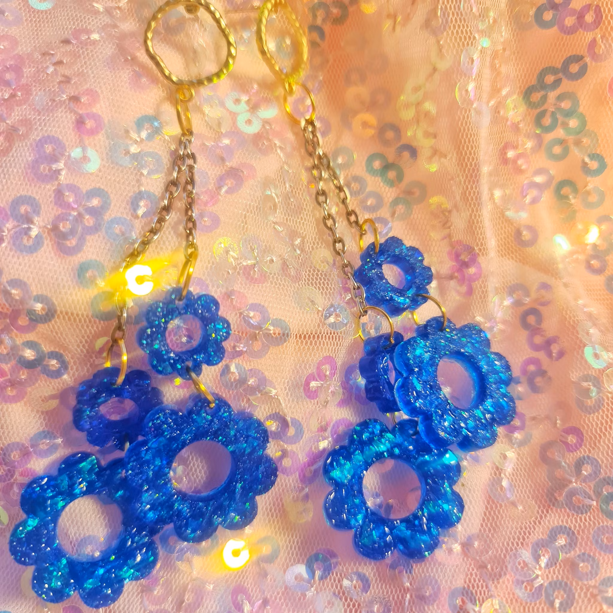 BLÅKLINT 349 kr SLUTSÅLD :( Dela INFO Glittriga blåa örhängen med stift i resin. Nickelsäkra metalldelar i guldfärg. Endast ett exemplar. Handgjort av ditt lokala yrväder.